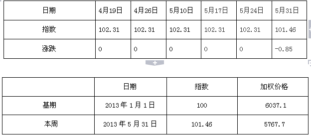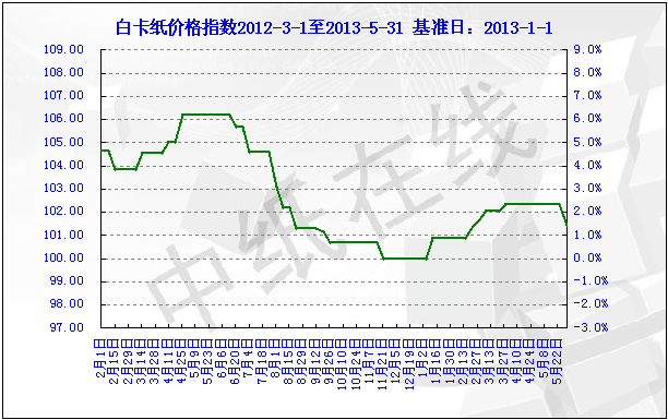 2013年5月31日白卡纸价格指数为101.46点,比上周下调0.85,较周期内最高点106.20(2012- 5-2)下将了4.47%。