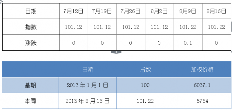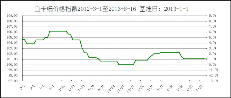 2013年8月16日白卡纸价格指数为101.22点,比上周持平,较周期内最高点106.20(2012- 5-2)下将了5.08%。