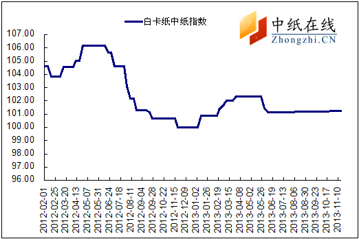 2013年11月15日白卡纸价格指数为101.22点,与上周持平,较周期内最高点106.02(2012- 5-2)下降了4.98%。